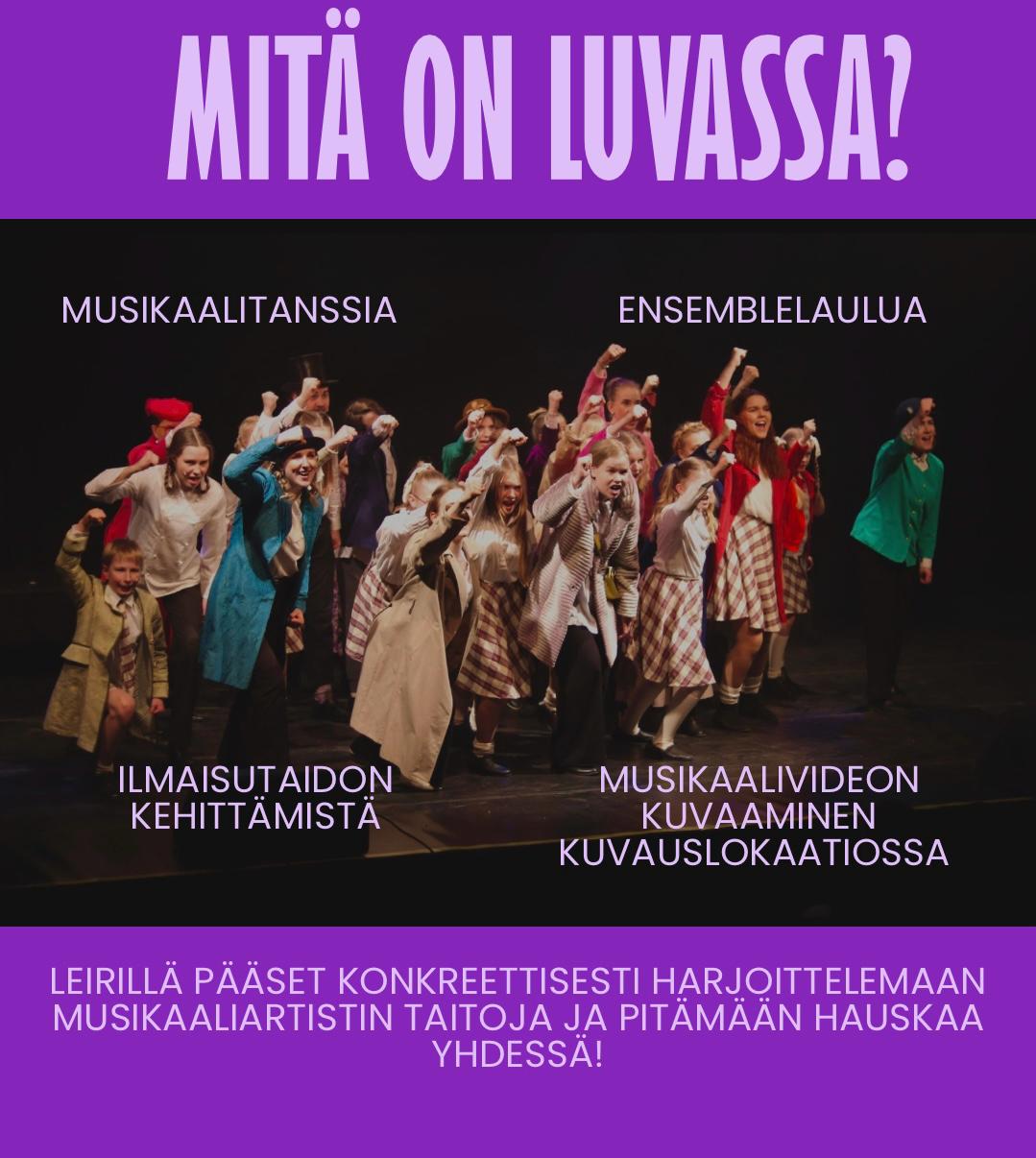 🌟Leirin vetäjinä toimivat Moden musikaalien takaa tunnetut Petra Myllyperkiö, Martta Entonen ja Esteri Seppälä. He pitävät huolen, että saat kaiken irti leirikokemuksesta!