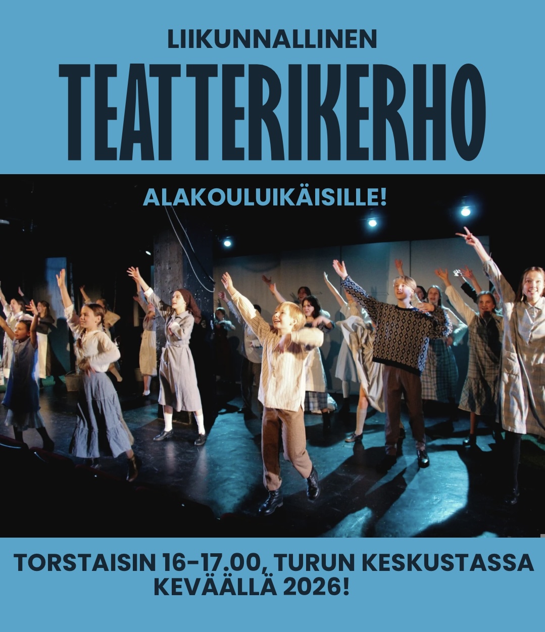 Torstaisin 16-17.00 cygnaeuksen koululla, osoite: Maariankatu 7, 20100 Turku.Kerhon ohjaajana toimii Esteri Seppälä, joka valmistuu keväällä teatteri-ilmaisun ohjaajaksi Turun AMK:n Taideakatemiasta.Liikunnallisessa teatterikerhossa tutustutaan teatterin maailmaan erilaisten hauskojen harjoitteiden ja improvisaatioleikkien kautta. pidetään hauskaa...